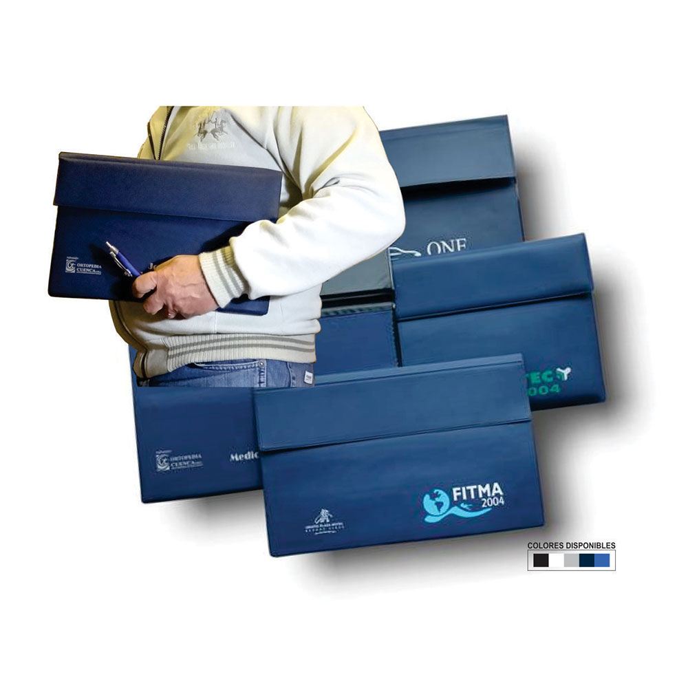 El portafolio simple es confeccionado en tela pvc con la base rígida forrada con cartón.