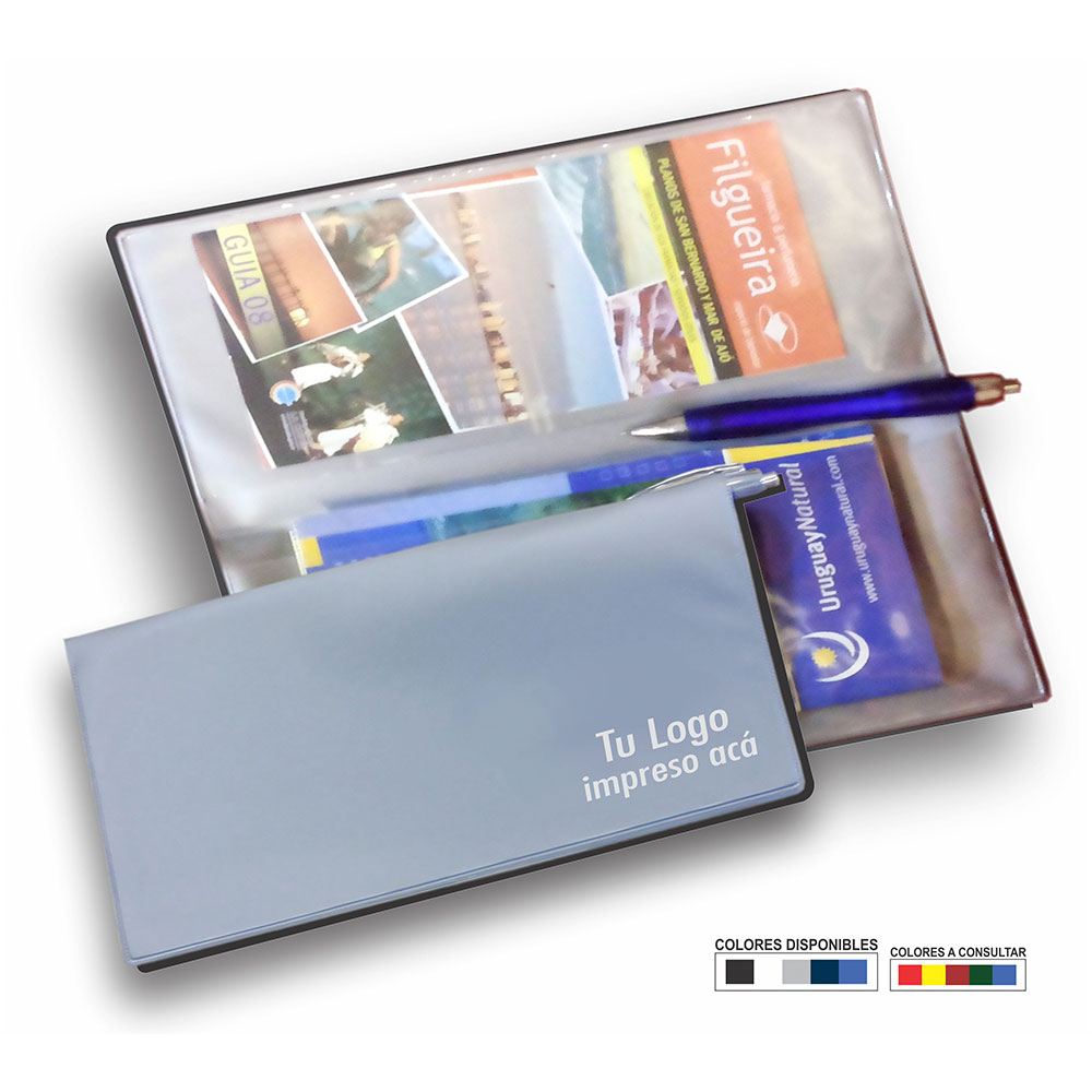 Es un Porta Voucher o Porta Documentación confeccionado al frente en tela plástica color / cristal o cristal esmerilado.